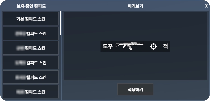 단축키 F6를 눌러 킬피드메뉴에 접근할 수 있습니다. 킬피드는 이벤트 참여 또는 개인 킬피드 스킨 신청을 통해 획득할 수 있습니다.