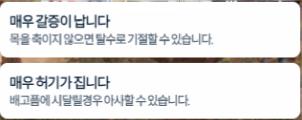 배고픔 과 목마름이 부족할 경우 우측 중앙에 경고문이 뜨고 체력을 채우지 않으면 죽게 됩니다.