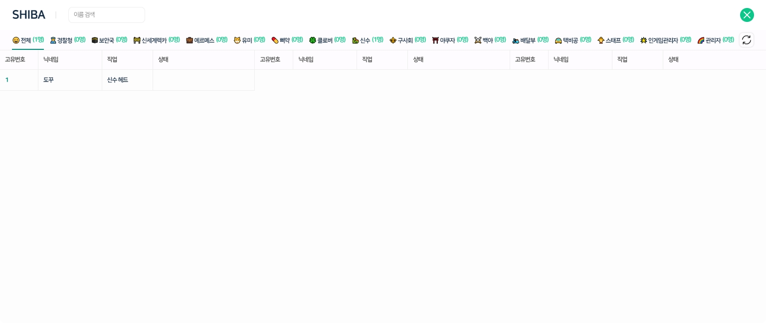 단축키 F7를 눌러 유저리스트 메뉴에 접근할 수 있습니다. 유저에게 우클릭하여 정보보기, 내위치 보내기, 계좌입금이 가능합니다. 상태탭에서 플레이어에 대한 간단한 상태를 알 수 있습니다. (잠수존, 자리비움, 구금)