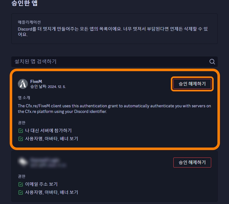 승인된 앱 목록에서 FiveM을 선택하고 우측 상단의 승인 해제하기 버튼을 눌러 연동을 해제합니다