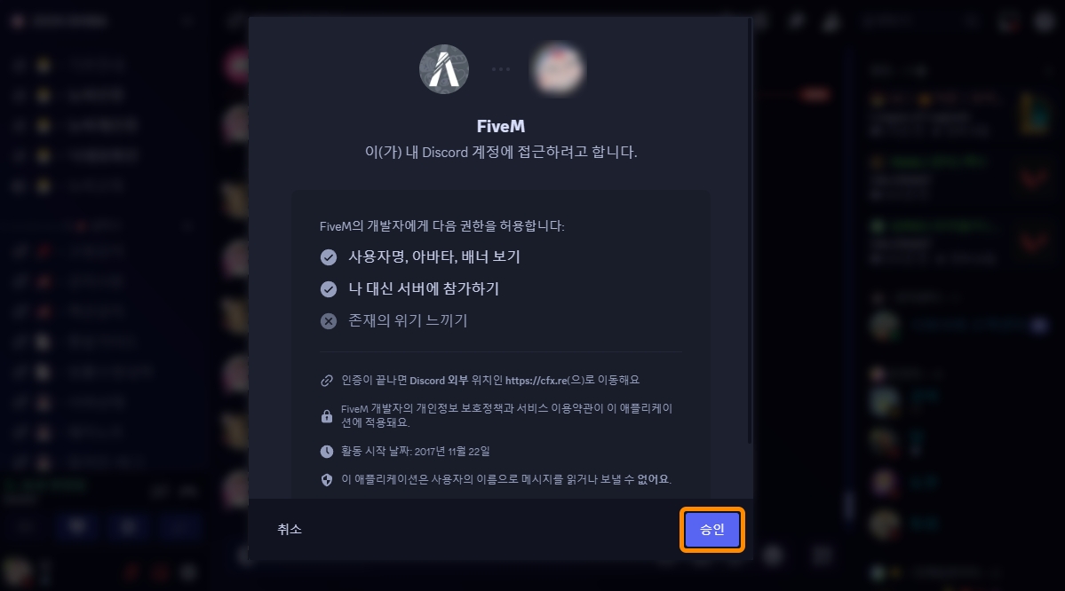 디스코드 화면에 FiveM 승인 창이 뜰 때까지 기다린 후 승인을 클릭합니다.
