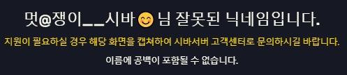 서버에서 닉네임 오류로 접속이 거부될 수 있습니다. 예: 멋@쟁이__시바😀님 잘못된 닉네임입니다.